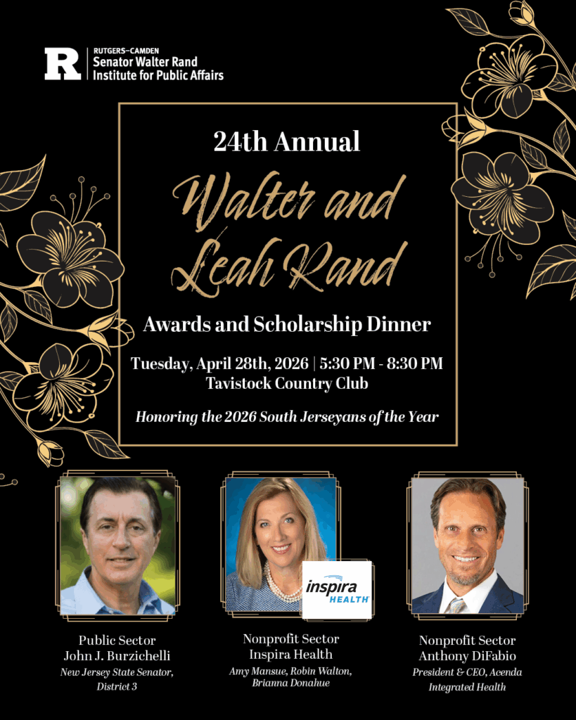 The Senator Walter Rand Institute for Public Affairs (WRI) honors former Senator Walter Rand’s legacy of public service to Southern New Jersey and his hometown of Camden city. Senator Rand and his wife Leah shared a passion for public service and supporting programs for youth. Together, they dedicated their time, talents and treasure toward helping South Jersey’s children and communities thrive. Each year, their work lives on through the Walter & Leah Rand Awards and Scholarship Dinner.